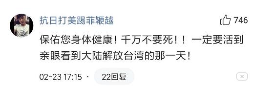 對于李登輝此次入院,大陸網(wǎng)友也“十分關(guān)切”。不少網(wǎng)友在留言中表示,希望臺(tái)灣方面能夠?qū)ζ淙尵,而理由則是一定要讓這位老牌“臺(tái)獨(dú)”分子,親眼目睹祖國統(tǒng)一的到來。