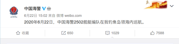 與此同時,中國也用實際行動回應(yīng)。據(jù)中國海警局官方微博發(fā)布的消息,6月22日,中國海警2502艦艇編隊在我釣魚島領(lǐng)海內(nèi)巡航。這是進(jìn)入2020年以來,中國海警艦艇編隊第10次在我釣魚島領(lǐng)海內(nèi)巡航。