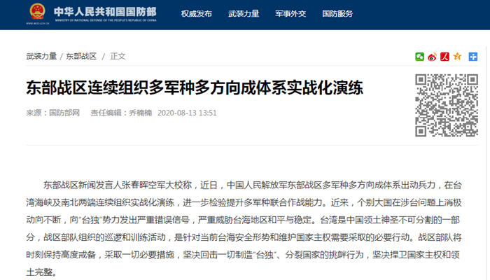 13日下午,中國人民解放軍東部戰(zhàn)區(qū)對外宣布,近日將在臺灣海峽及南北兩端連續(xù)組織實戰(zhàn)化演練,并明確指出,近來,個別大國在涉臺問題上消極動向不斷,向“臺獨”勢力發(fā)出嚴重錯誤信號,嚴重威脅臺海地區(qū)和平與穩(wěn)定。