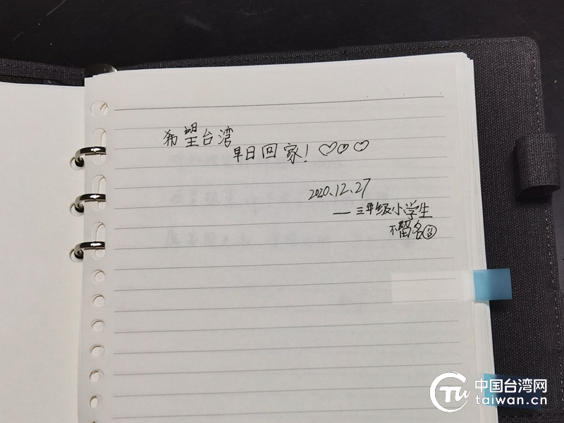 此外,還有一位署名“三年級小學(xué)生”的觀眾,在留言簿上畫了三顆小愛心,寫了一句話,“希望臺灣早日回家”。這些留言,每一字每一句都是兩岸同胞血濃于水骨肉親情的真情流露,強烈地表達了一種希望祖國能夠早日統(tǒng)一的心情。
