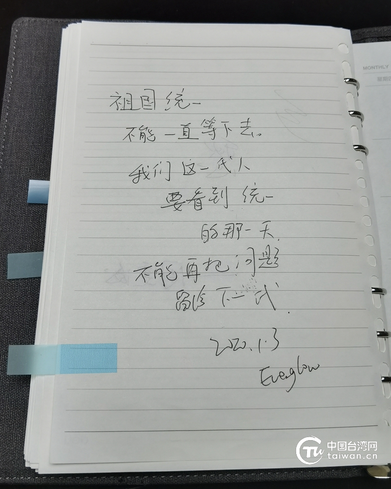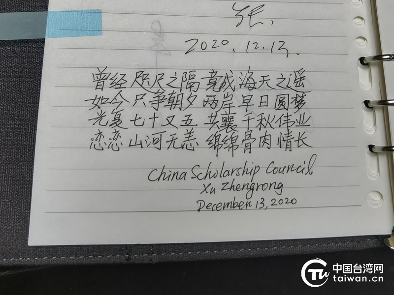 13日上午,在國臺辦2021年的首場新聞發(fā)布會上,新聞發(fā)言人朱鳳蓮讀了幾則感人肺腑的話語,“曾經(jīng)咫尺之隔,竟成海天之遙。如今只爭朝夕,兩岸早日圓夢。光復(fù)七十又五,共襄千秋偉業(yè)。戀戀山河無恙,綿綿骨肉情長!薄白鎳y(tǒng)一不能一直等下去,我們這一代人要看到統(tǒng)一的那一天,不能把問題留給下一代!边@是來自于“金甌無缺——紀念臺灣光復(fù)七十五周年主題展”線下展覽留言簿上的留言。