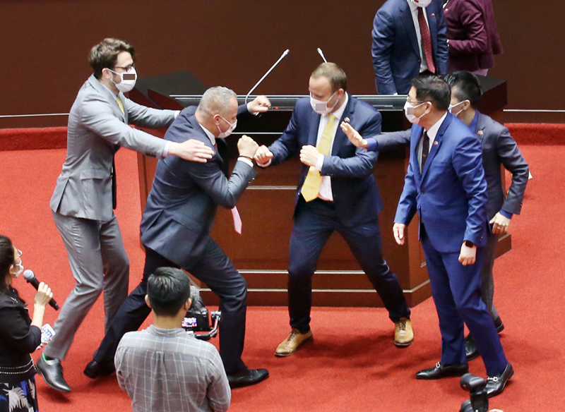 據(jù)報(bào)道,這兩名參訪團(tuán)員身著西裝、面對(duì)面擺起拳擊場上的對(duì)峙姿勢(shì),作勢(shì)扭打;而其他議員也“融入”假裝上前勸架,一行人玩得十分開心并留影紀(jì)念。對(duì)此,陪同參訪的綠營民代稱:“對(duì)方是用這種方式來表達(dá),民主本來就是多元,訪問團(tuán)對(duì)臺(tái)灣的民主是很肯定的!辈簧倥_(tái)媒竟然還反以為榮,以“名揚(yáng)國際”“打架超紅”“國際認(rèn)證”“臺(tái)灣印象”為題報(bào)道此新聞。