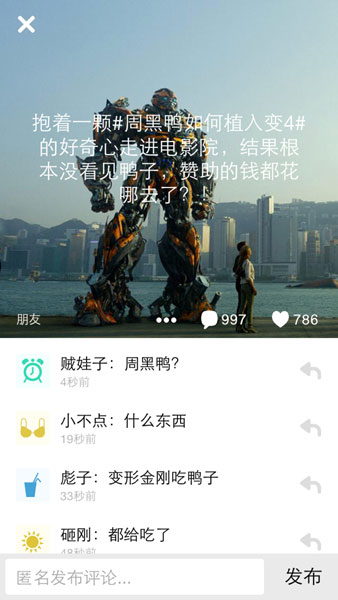 以往觀眾看完電影后都選擇上微博,天涯,豆瓣等地兒進(jìn)行吐槽,深思熟慮“吐”出水平實(shí)屬不易,不同于微博上面的中性評價,匿名社交平臺上面吐槽更加無下限,尤其是目前在匿名社交中大熱的烏鴉成為了大家吐槽的新寵,可以毫無心理包袱的無下限吐槽滿足了大家新的宣泄需求。