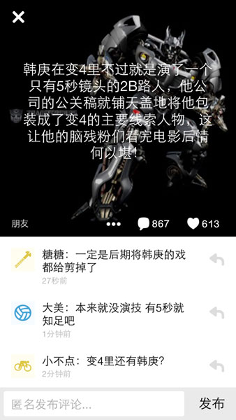 隨著匿名社交的興起,大家不再滿足于在微博,天涯,豆瓣等地進(jìn)行吐槽了,在烏鴉上面,觀眾,尤其是圈內(nèi)人士不再顧忌工作關(guān)系,和其他社交平臺相比,他們的宣泄更加肆無忌憚和無下限,也許未來嗅覺靈敏的公關(guān)團(tuán)隊就會將合作業(yè)務(wù)拓展到匿名社交了。