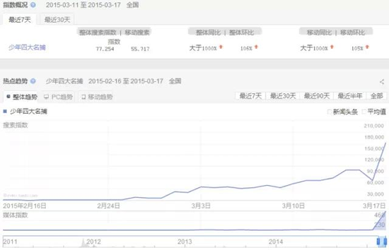 在《少年四大名捕》中,魚塘主拼命?,陳偉霆一直在賣萌,何晟銘畫上邪魅的紫色眼影,貌似還有些秀基情……這哪里是電視劇,這分明是男神養(yǎng)眼視覺秀,《少年四大名捕》首播開篇打斗戲長達(dá)半小時(shí),密集的特效運(yùn)用令人應(yīng)接不暇,被觀眾稱贊具有復(fù)制《古劍》奇跡的潛質(zhì)。在魔幻特效的加持下,畫面顯得行云流水、出神入化。優(yōu)秀的劇情、完美的特技、加上養(yǎng)眼的面孔,怪不得《少年四大名捕》成為時(shí)下最火電視劇,沒有之一。在首播后第一天的新浪微博電視劇話題榜上,前三位中居然有兩個(gè)和該劇相關(guān),第一名是#少年四大名捕#,第三名為#少年四大名捕317開播#。其中話題#少年四大名捕#已經(jīng)取得5.5億的閱讀量和高達(dá)75.3萬的討論量(截至3月18日12時(shí)),而該劇百度指數(shù)上的表現(xiàn),也可以反映出首播有多么萬眾期待,首播之后,一度接近18萬的指數(shù)高位。