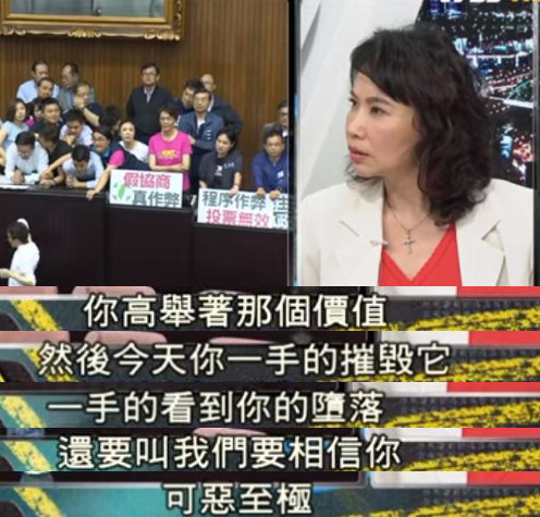 陳風(fēng)馨表示,民進(jìn)黨自己高喊的民主價(jià)值被它一手摧毀。它自己摧毀了整個(gè)臺(tái)灣的信任基礎(chǔ)之后,接著說我就算用一個(gè)我自己的同志來當(dāng)“中選會(huì)主委”你們也要相信,這怎么可能?