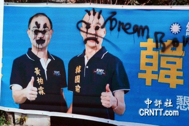 藍營高雄選將黃柏霖與韓國瑜合照的競選看板遭噴漆破壞。(圖片來源:中評社)