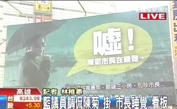 據(jù)臺灣《聯(lián)合報》報道,“噓!陳菊市長在睡覺!辟即笈_北車站大廳設置廣告,讓“睡菊”風波延燒到臺灣北部。據(jù)透露,這是藍營最新的催票文宣,希望高雄人返鄉(xiāng)投票。