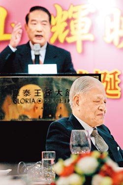 李登輝(前)3日過農(nóng)歷90歲壽宴,親民黨主席宋楚瑜(后)上臺致詞。圖片來源:臺灣《中國時報》。