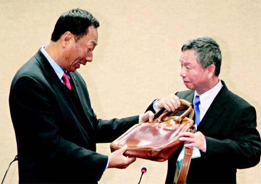臺(tái)當(dāng)局前“衛(wèi)生署長(zhǎng)”楊志良(右)公益拍賣隨身公文包,鴻海集團(tuán)董事長(zhǎng)郭臺(tái)銘(左)得標(biāo)后,14日在臺(tái)大公衛(wèi)學(xué)院面交。楊志良在公文包簽名及寫(xiě)下“感恩”兩字,郭臺(tái)銘則簽名寫(xiě)下“好膽愛(ài)心包”還贈(zèng)楊志良。圖片來(lái)源:臺(tái)灣《聯(lián)合報(bào)》