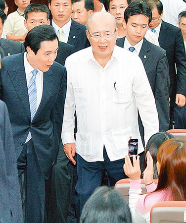 馬英九(左)23日到桃園縣政府,參加吳伯雄(右)父親吳鴻麟獎學(xué)金頒獎典禮,離去前有同學(xué)在位置上以手機(jī)拍照,馬英九露出逗趣的表情。(來源:臺灣《中時電子報》)