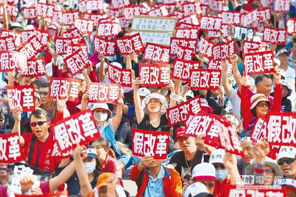 民進(jìn)黨對(duì)藍(lán)營(yíng)“鐵票群”“開鍘”!败姽獭蓖诵萑藛T多數(shù)支持國(guó)民黨,是藍(lán)營(yíng)“鐵票部隊(duì)”。為削弱國(guó)民黨支持力量,民進(jìn)黨當(dāng)局利用“年金改革”方案盡量削減“軍公教”人員的退休金及補(bǔ)貼,美其名曰縮小貧富差距,維持社會(huì)“公平正義”,這直接觸怒了“軍公教”群體。年內(nèi),“軍公教”群體已經(jīng)多次舉行街頭抗議活動(dòng),此次抗?fàn)幦藬?shù)更多、呼聲更強(qiáng),引發(fā)島內(nèi)社會(huì)波動(dòng)。