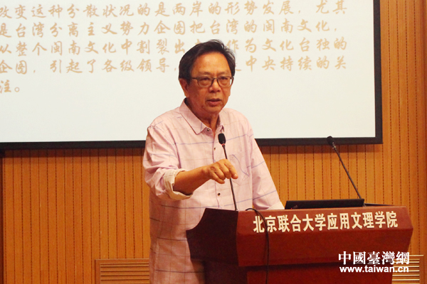 福建省廈門市閩南文化研究會(huì)會(huì)長(zhǎng)陳耕圍繞“閩南文化研究新世紀(jì)的回顧與新時(shí)代的前瞻”進(jìn)行主題發(fā)言。(中國(guó)臺(tái)灣網(wǎng) 張潔 攝)