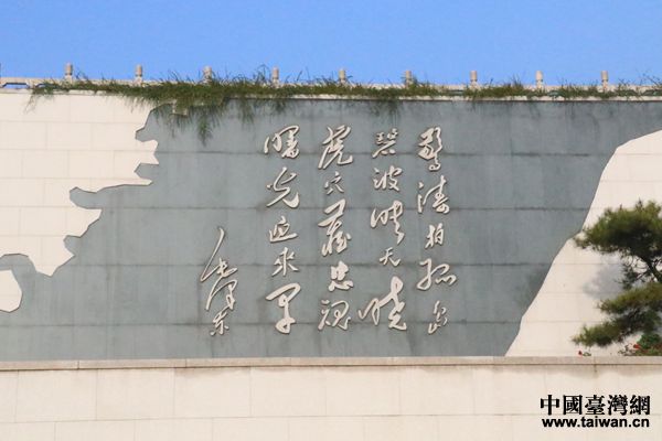廣場巨幅景觀墻上面刻有毛澤東主席題詩:“驚濤拍孤島,碧波映天曉;⒀ú刂一,曙光迎來早”。(中國臺灣網(wǎng) 李杰 攝)