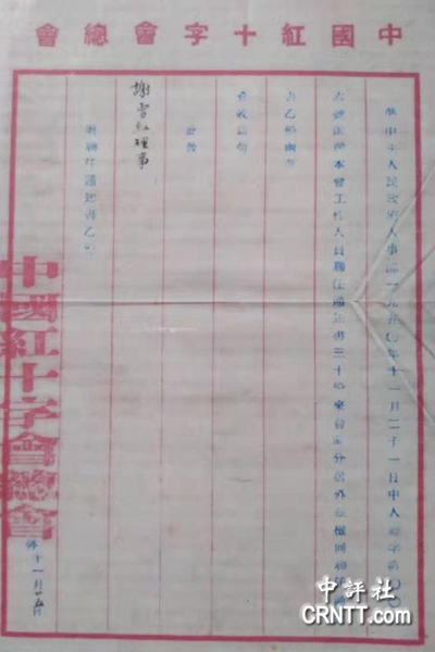 我曾見中國紅十字會總會致謝雪紅理事函(圖一),其文曰:“準(zhǔn)中央人民政府人事部1950年11月21日中人廳字第0066號函送本會工作人員聘任通知書30份來會,(字跡模糊)分送外,茲檢同聘任通知書乙份函請查收為荷。此致謝雪紅理事。中國紅十字會總會啟。11月25日”。中央人民政府人事部是1950年9月5日設(shè)立的,負(fù)責(zé)各類干部的管理工作;其時(shí),中國紅十字會是“中央人民政府領(lǐng)導(dǎo)之人民衛(wèi)生救護(hù)團(tuán)體”,其理事聘任由中央人民政府人事部負(fù)責(zé)。