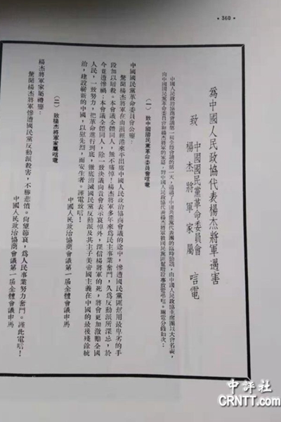 圖一,《中國(guó)人民政協(xié)為楊杰遇害致唁電》(來(lái)源:汪毅夫提供)