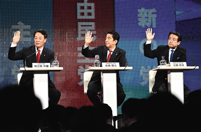 11月29日,日本東京,安倍晉三(中)代表執(zhí)政黨自民黨參加黨首辯論。日本將于下月14日舉行眾議院大選投票,獲得過半數(shù)議席的政黨將贏得政權(quán)。