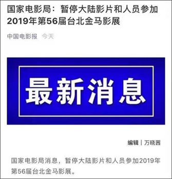 繼不到一周前文旅部公告暫停大陸居民赴臺(tái)個(gè)人游試點(diǎn)之后,國家電影局今天上午發(fā)布消息,暫停大陸影片和人員參加2019年第56屆臺(tái)北金馬影展。