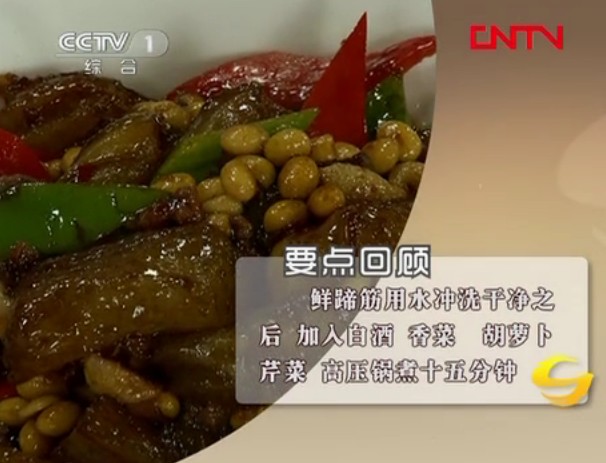 channelId 1 1 《天天飲食》 20120105 黃豆燒蹄筋 8f13f4fb0fa941c79c0b2235a200cb20 2 本節(jié)目介紹了“黃豆燒蹄筋”的制作方法: 1、主料:牛蹄筋; 2、輔料:黃豆、肉末; 3、調(diào)料:辣醬、桂皮、八角; 4、制作方法:(1)洗凈鮮蹄筋后,加入白酒、香菜、胡蘿卜、芹菜,高壓鍋煮十五分鐘;(2)熱鍋涼油放入蔥姜蒜、八角、桂皮炒出香味之后,烹入醬油和水,燒開之后撈出調(diào)料;(3)倒入蹄筋,加入鹽、胡椒粉、黃豆,開大火把蹄筋煮爛之后,潷出湯汁;(4)鍋中倒入色拉油和香油放入大蒜和肉末炒散之后調(diào)入白糖,炒化之后倒入牛蹄筋和黃豆;(5)沖入少許的涼水,烹入醬油、鹽、辣醬,出鍋前淋上水淀粉、放入青紅椒即可。(天天飲食 2012年 第5期)