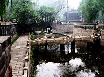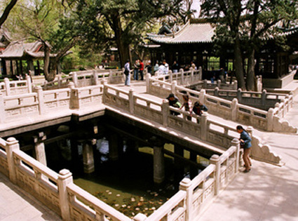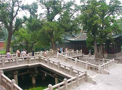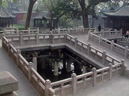 古人以圓形為池,方形為沼,此方形池中多魚(yú),所以取名魚(yú)沼。至于所謂“飛梁”,本著“架橋?yàn)樽,若飛也”、“飛梁石磴,陵跨水道”的說(shuō)法,這是晉水的第二源流,沼上架十字形板,橋沼內(nèi)立三十四根約30厘米見(jiàn)方的小八角形石柱,柱頭卷殺,柱頂架斗拱與橫梁,承托著十字形橋面(具體做法為柱上交以著柏枋,上置大斗,斗上是十字相交,乃以承接梁、額),就是飛梁。