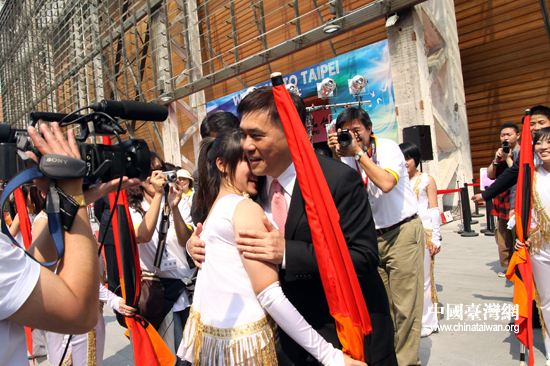 郝龍斌在開館儀式后特別擁抱感謝女子儀仗旗隊可愛的學(xué)生們(中國臺灣網(wǎng) 李徽 攝)