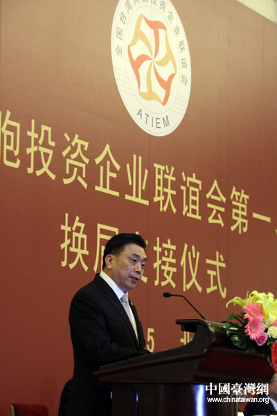 中臺辦、國臺辦主任王毅出席全國臺企聯(lián)第二屆會長換屆交接儀式,首屆會長張漢文(右一)、第二屆會長郭山輝(左一)。(中國臺灣網(wǎng)發(fā))