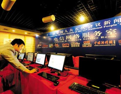 新聞中心設(shè)有新聞發(fā)布廳、采訪接待室、網(wǎng)絡(luò)訪談室、電信網(wǎng)絡(luò)服務(wù)室以及記者茶歇處。新聞中心的境內(nèi)記者組、港澳臺記者組和外國記者組,分別接待獲準(zhǔn)采訪的境內(nèi)記者、港澳臺記者和外國記者,為記者采訪提供服務(wù)。電信網(wǎng)絡(luò)服務(wù)室設(shè)有上網(wǎng)電腦以及多個機動網(wǎng)絡(luò)席位,為參會記者提供便捷的網(wǎng)絡(luò)服務(wù)。