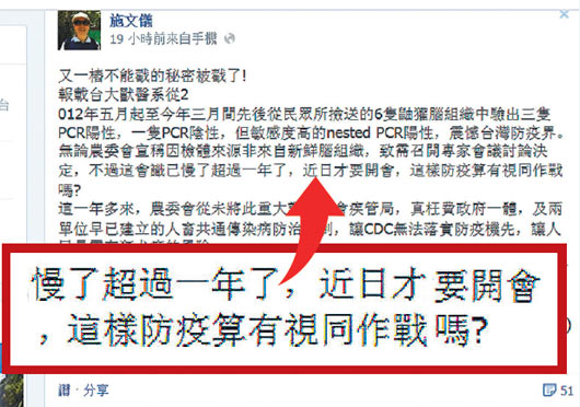 7月3日龐飛團隊在“最后一點剩余的腦乳劑”中,發(fā)現(xiàn)一些完整細胞,在臺大、家衛(wèi)所雙重檢測后,上周末判定為陽性!稗r(nóng)委會”、“衛(wèi)生署”昨日召開狂犬病專家會議,人醫(yī)、獸醫(yī)一致確診為狂犬病。