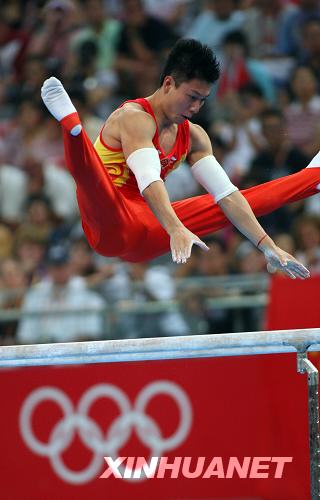8月19日,中國選手李小鵬在雙杠決賽中。當(dāng)日,中國選手李小鵬在國家體育館進(jìn)行的北京奧運(yùn)會體操男子雙杠決賽中以16.450分的成績奪得冠軍。 新華社記者林慧攝