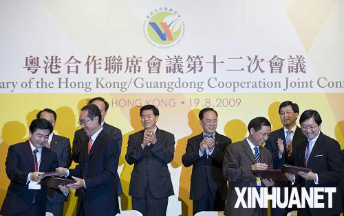8月19日,香港特區(qū)行政長(zhǎng)官曾蔭權(quán)與廣東省省長(zhǎng)黃華華等在簽約儀式上。新華社記者 呂小煒 攝