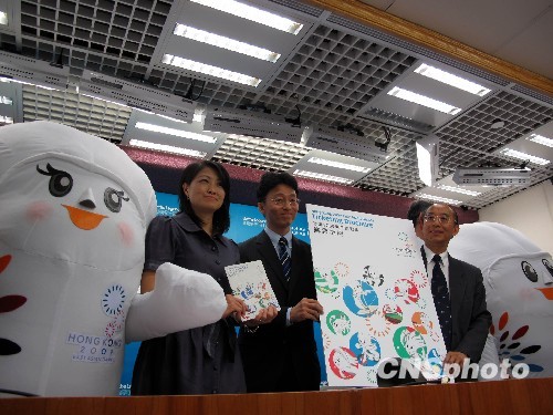 八月二十四日,香港宣布第五屆東亞運動會門票將于八月三十一日開始公開發(fā)售。圖為香港特區(qū)民政事務(wù)局副秘書長劉明光(右二)與二00九東亞運動會(香港)有限公司行政總裁胡偉民(右一)等,在記者會上介紹東亞運門票發(fā)售詳情。 中新社發(fā) 黎金良 攝