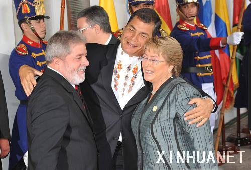 8月10日,在厄瓜多爾首都基多,厄瓜多爾總統(tǒng)科雷亞(中)在會(huì)場門口與巴西總統(tǒng)盧拉(左)、智利總統(tǒng)巴切萊特?fù)肀е乱。?dāng)日,第三屆南美洲國家聯(lián)盟首腦會(huì)議在厄瓜多爾首都基多拉開帷幕,來自12個(gè)成員國的政府首腦和代表出席會(huì)議,并通過《基多聲明》,呼吁加強(qiáng)區(qū)域一體化,并希望避免外國軍事勢力在該地區(qū)的存在。新華社記者 宋為偉 攝