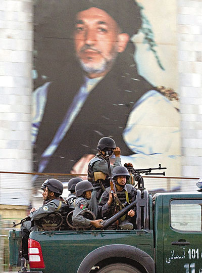 一隊(duì)武裝警察巡邏經(jīng)過現(xiàn)任總統(tǒng)卡爾扎伊的選舉海報(bào)