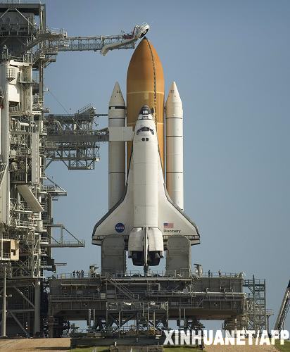 8月24日,在美國佛羅里達(dá)州卡納維拉爾角,“發(fā)現(xiàn)”號航天飛機(jī)矗立在肯尼迪航天中心的發(fā)射臺上。美國宇航局25日宣稱,由于天氣原因“發(fā)現(xiàn)”號航天飛機(jī)再次推遲發(fā)射。新華社/法新
