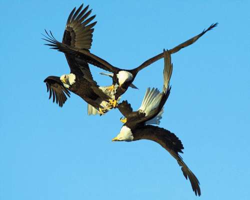 三只白頭鷹在空中六爪相纏