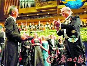 10日,在瑞典首都斯德哥爾摩舉行的2009年諾貝爾獎(jiǎng)?lì)C獎(jiǎng)儀式上,瑞典國(guó)王卡爾十六世?古斯塔夫向華裔科學(xué)家高錕(左)頒獎(jiǎng)。