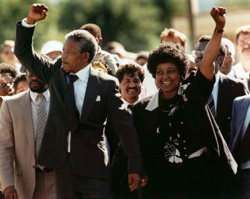 一九九○年二月,剛剛獲釋的曼德拉與妻子向支持者致意(資料圖)。