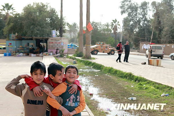 在伊拉克首都巴格達,幾名兒童在伊安全部隊軍車前玩耍。 [資料圖片]