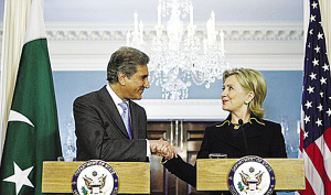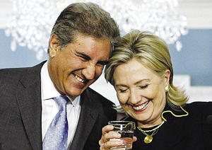 據(jù)報(bào)道,巴基斯坦外交部長(zhǎng)庫雷希于日前前往美國訪問,3月24日,在美國國務(wù)院,美國國務(wù)卿希拉里與巴基斯坦外長(zhǎng)庫雷希首先進(jìn)行了雙邊會(huì)談,然后舉行新聞發(fā)布會(huì),回答記者提出的各種國際局勢(shì)問題。在記者會(huì)上,希拉里和巴基斯坦外長(zhǎng)庫雷希共同宣布兩國將展開“全新的合作精神”。在回答記者提問的間隙,希拉里和庫雷希大聲說笑,舉止異常親密!