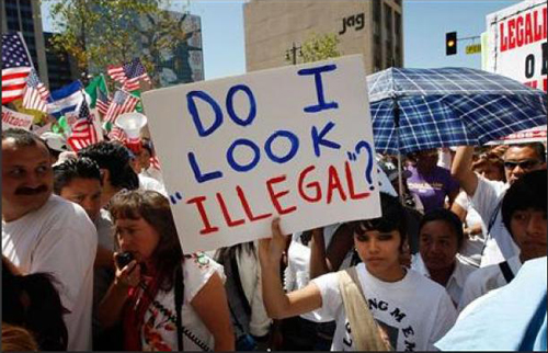 洛杉磯舉行抗議亞利桑那州新移民法大游行。一位抗議者手拿的牌子上寫著:我看起來不合法嗎?