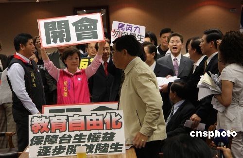 臺灣“立法院內(nèi)政委員會”4日排定審議攸關(guān)大陸學(xué)歷認(rèn)證、陸生來臺的“兩岸人民關(guān)系條例”修正草案,下午議程因民進(jìn)黨“立委”將委員會會議室大門反鎖,導(dǎo)致議事停擺。圖為民進(jìn)黨“立委”占據(jù)主席臺后,國民黨“立委”舉起要求正常開會的標(biāo)語牌。(圖片來源:中新社)