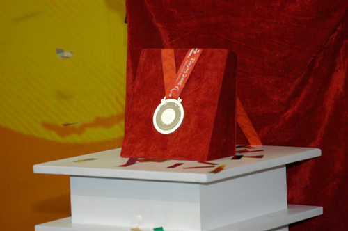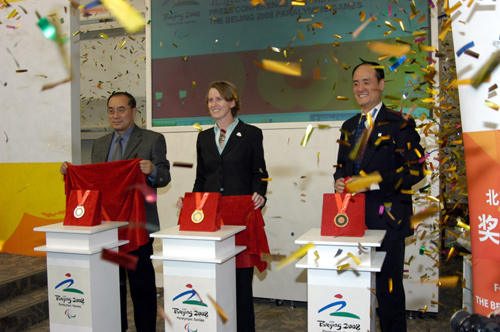 發(fā)布儀式現(xiàn)場,北京奧組委文化活動(dòng)部部長趙東鳴,北京奧組委殘奧會(huì)部部長張秋平以及北京2008殘疾人獎(jiǎng)牌贊助商代表共同為殘奧會(huì)獎(jiǎng)牌式樣揭幕。