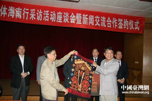 海南省新聞工作者協(xié)會(huì)副主席兼秘書長(zhǎng)郭澤福、《海南日?qǐng)?bào)》副總編廉振孝、海南廣播電視臺(tái)副臺(tái)長(zhǎng)李公羽先后發(fā)言,向來訪的臺(tái)灣同行介紹了海南省新聞工作者協(xié)會(huì)和海南媒體的基本情況。