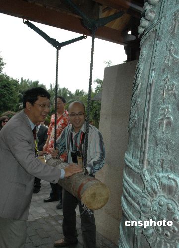 兩岸媒體海南行十二月一日在三亞進(jìn)行采訪活動(dòng),圖為在三亞南山兩岸記者同撞和平鐘。 中新社發(fā) 王辛莉 攝