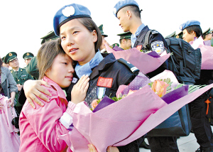 上午8時(shí)整,一架中國國際航空公司CF6-80C2專機(jī)穩(wěn)穩(wěn)地降落在白云機(jī)場停機(jī)坪,一面鮮紅的標(biāo)有“中國維和警察防暴隊(duì)”旗幟首先從機(jī)艙門飄出,緊接著,95名胸前佩戴聯(lián)合國“和平勛章”的維和隊(duì)員依次走下懸梯,已經(jīng)等候多時(shí)的家屬、戰(zhàn)友們立即沖了上去,當(dāng)維和隊(duì)員王勝抱起4歲的兒子王子天時(shí),實(shí)在忍不住紅了眼圈,因?yàn)樯洗伪饍鹤訒r(shí),這個(gè)小家伙才3歲。