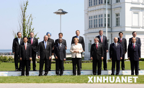 6月8日,國(guó)家主席胡錦濤在德國(guó)海利根達(dá)姆出席八國(guó)集團(tuán)同發(fā)展中國(guó)家領(lǐng)導(dǎo)人對(duì)話會(huì)議。這是會(huì)后與會(huì)領(lǐng)導(dǎo)人合影留念。 新華社記者鞠鵬攝
