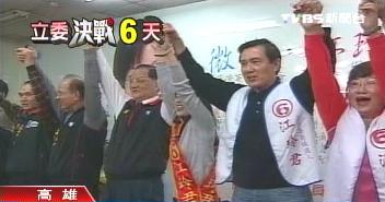 據(jù)臺灣“中廣新聞”報道,“立委”選舉前夕最后一個超級星期天,連戰(zhàn)特地南下高雄縣為4名國民黨“立委”候選人吳光訓(xùn)、江玲君、鍾紹和和林益世站臺造勢,馬英九也再度南下,陪同江玲君和吳光訓(xùn)到眷村掃街拜票。