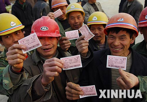 2007年1月30日,幾位來自四川樂山的農(nóng)民工展示剛買到的火車票。當日,合肥火車站派專人將火車票送到合肥至潛山高速公路岳西段工地,為長年在深山里務工的農(nóng)民工回家過年提供便利。(新華社記者李健攝)