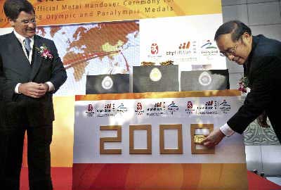 北京奧組委文化活動部部長趙東鳴(右)在交接儀式上將金屬材料安放在寫有2008字樣的橫幅上。