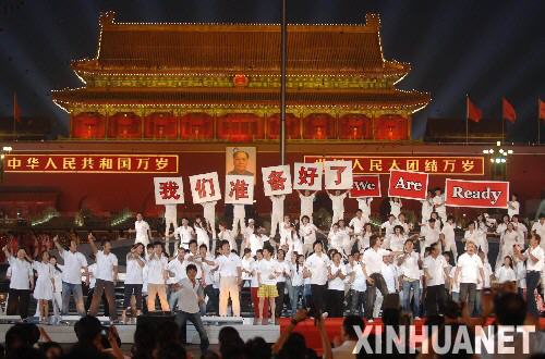 資料圖片:2007年8月8日,百名歌手一起演唱北京奧運(yùn)會(huì)倒計(jì)時(shí)一周年主題歌《我們準(zhǔn)備好了》。當(dāng)晚,北京2008年奧運(yùn)會(huì)倒計(jì)時(shí)一周年慶;顒(dòng)在天安門廣場舉行。 新華社記者羅曉光攝